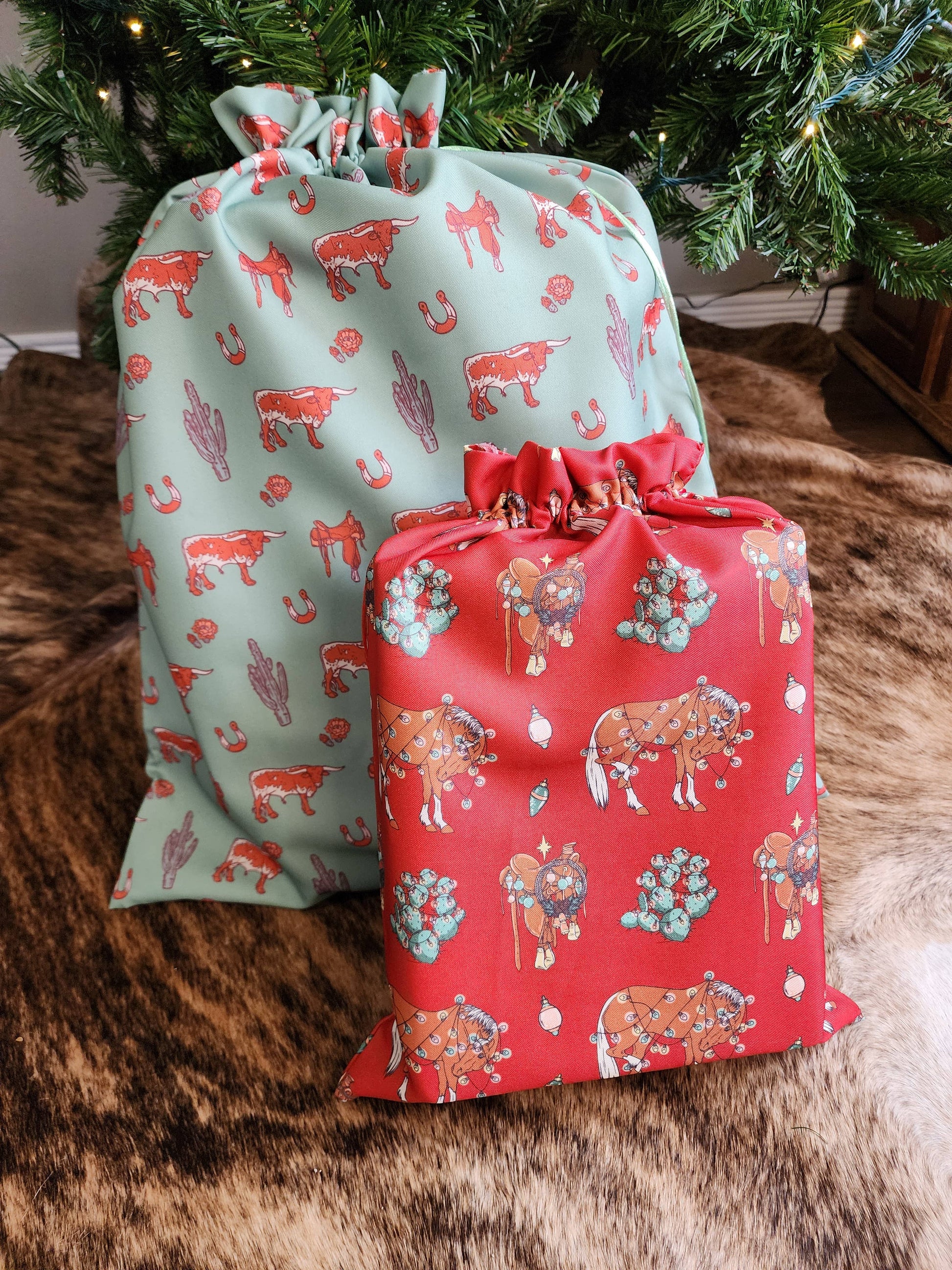 Each bag features our exclusive western-inspired prints — think bucking broncos, lassos, and desert stars — designed to bring the spirit of the West to every tree, stocking, or gift exchange. Made from durable, reusable fabric with a sturdy drawstring closure, these bags can be used year after year.