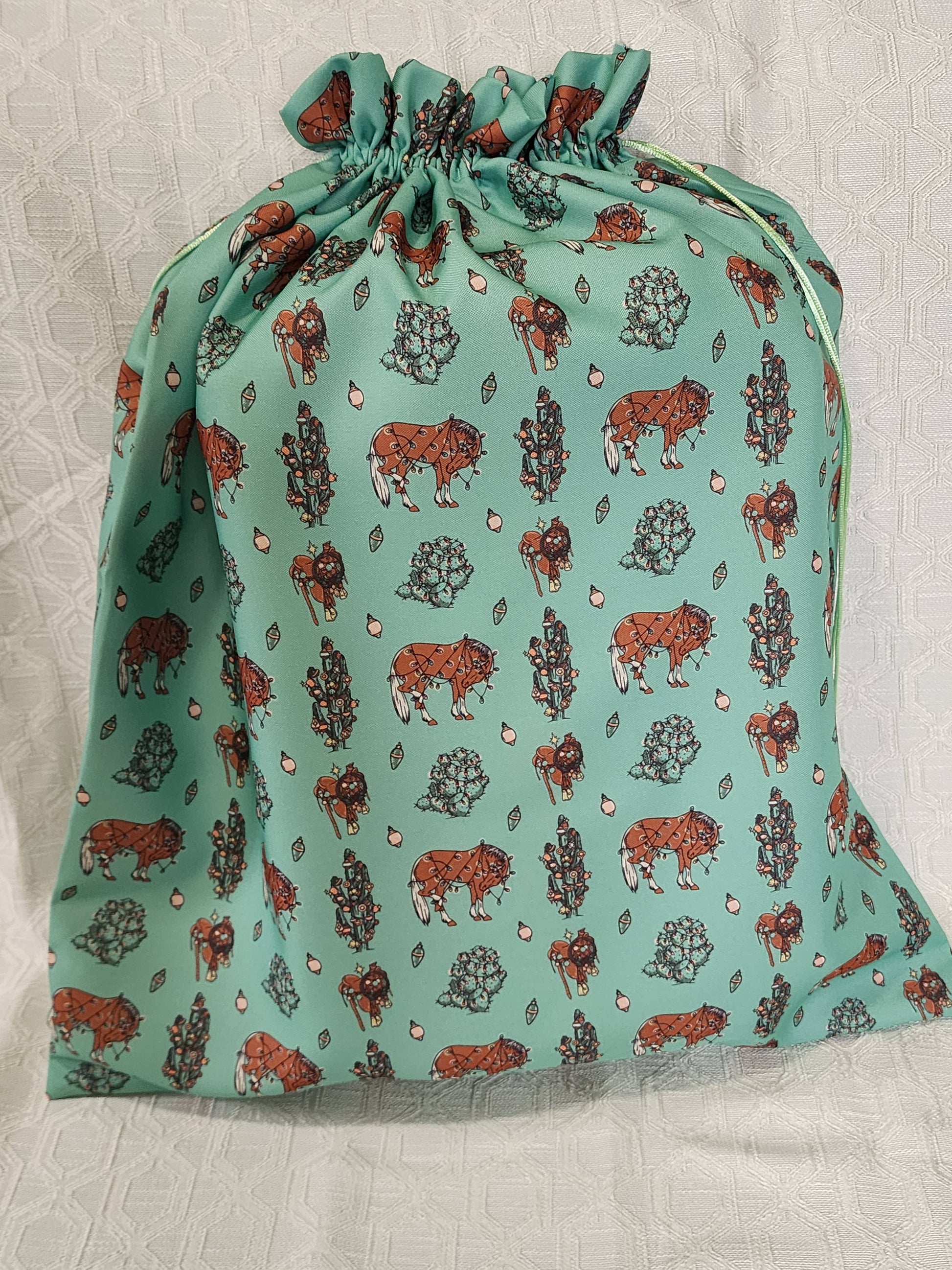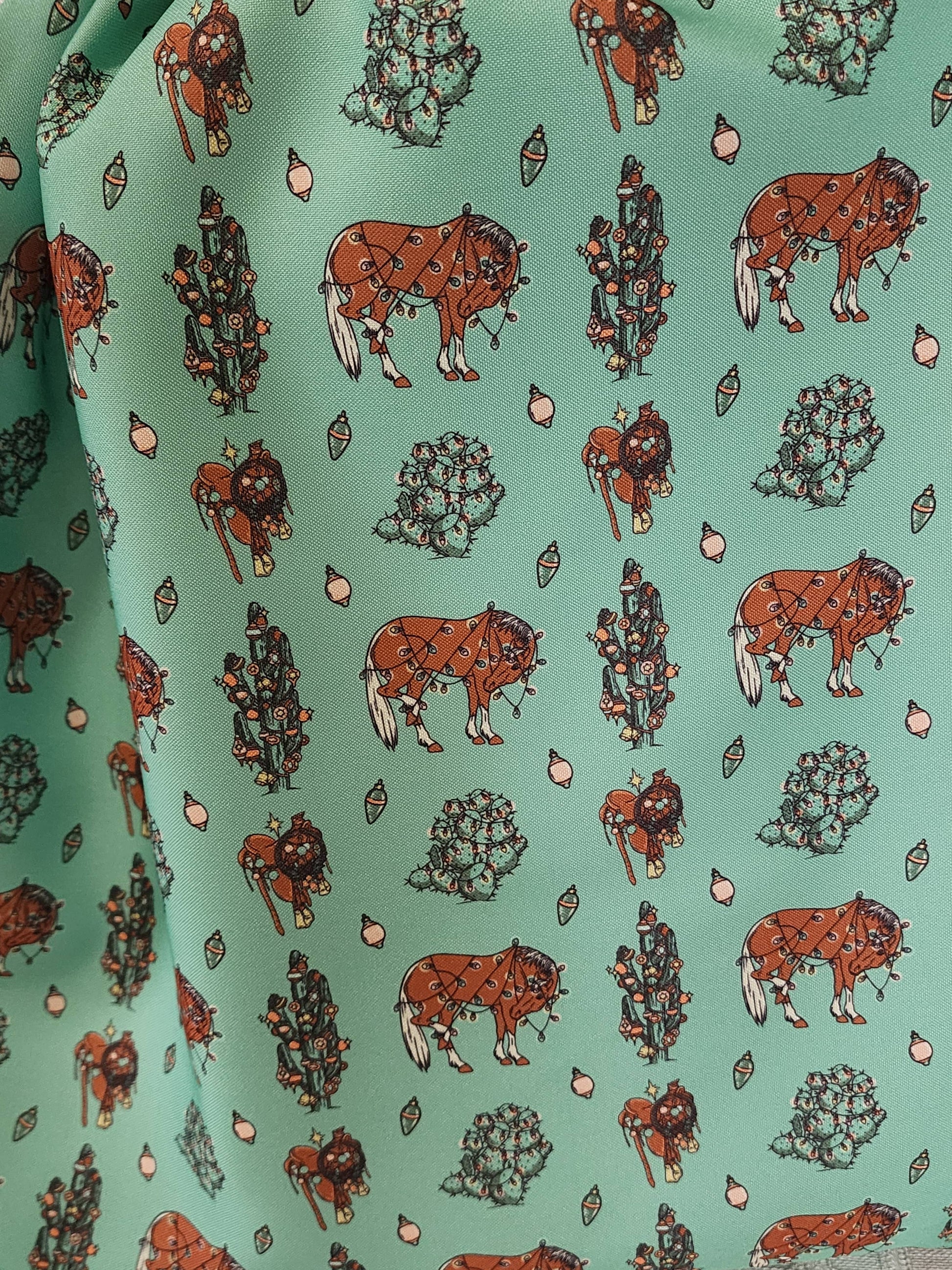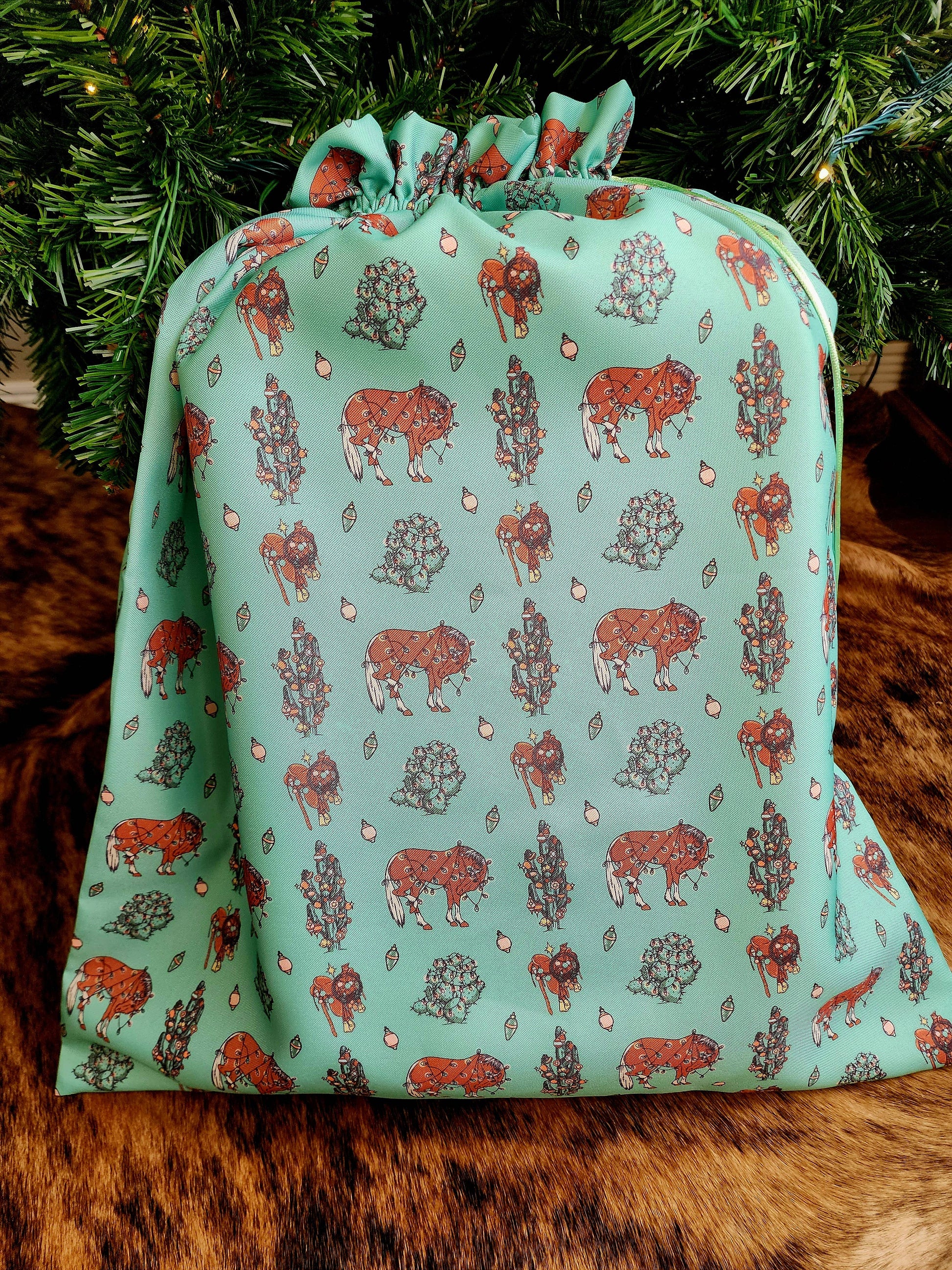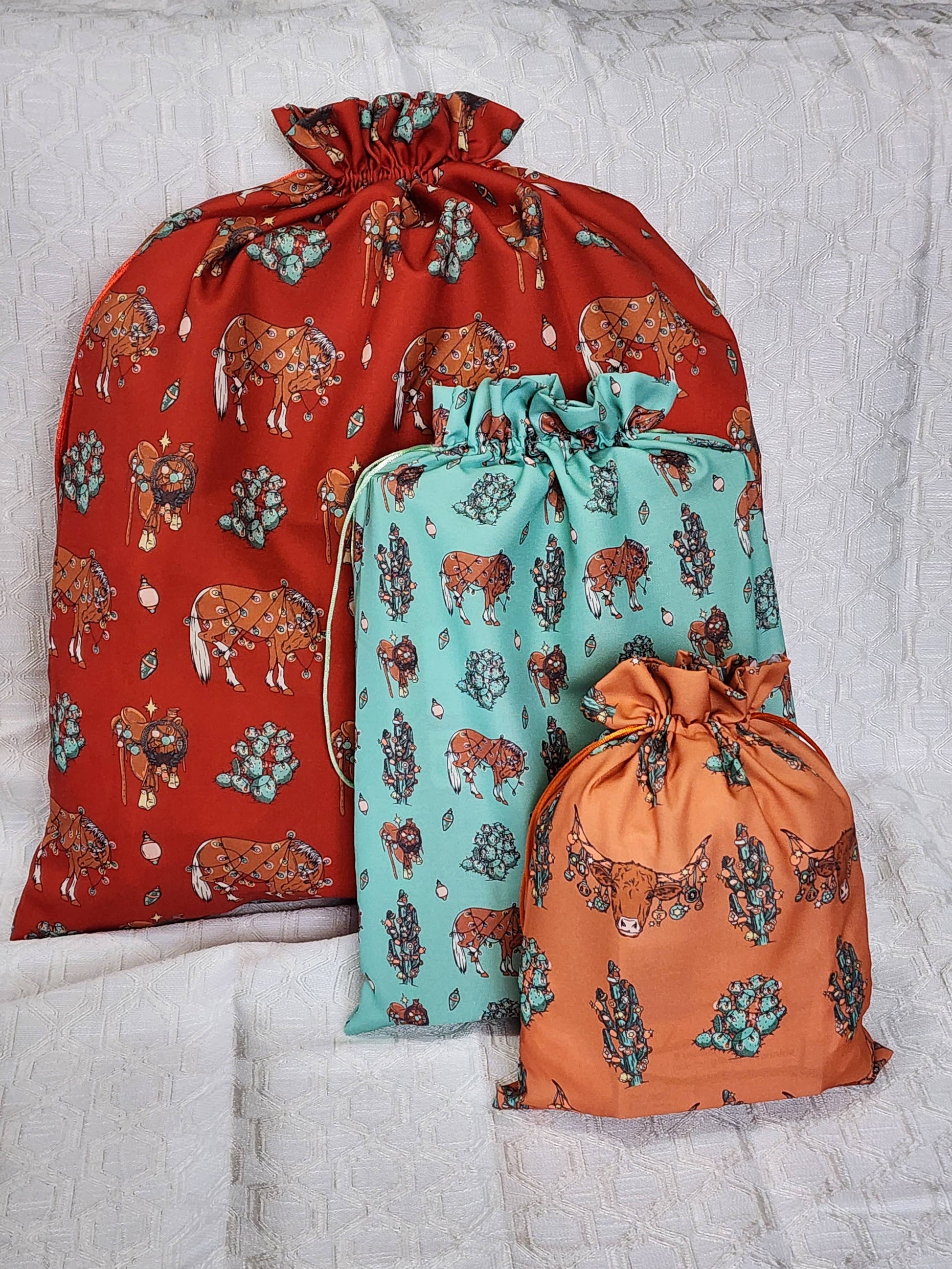 Each bag features our exclusive western-inspired prints — think bucking broncos, lassos, and desert stars — designed to bring the spirit of the West to every tree, stocking, or gift exchange. Made from durable, reusable fabric with a sturdy drawstring closure, these bags can be used year after year.