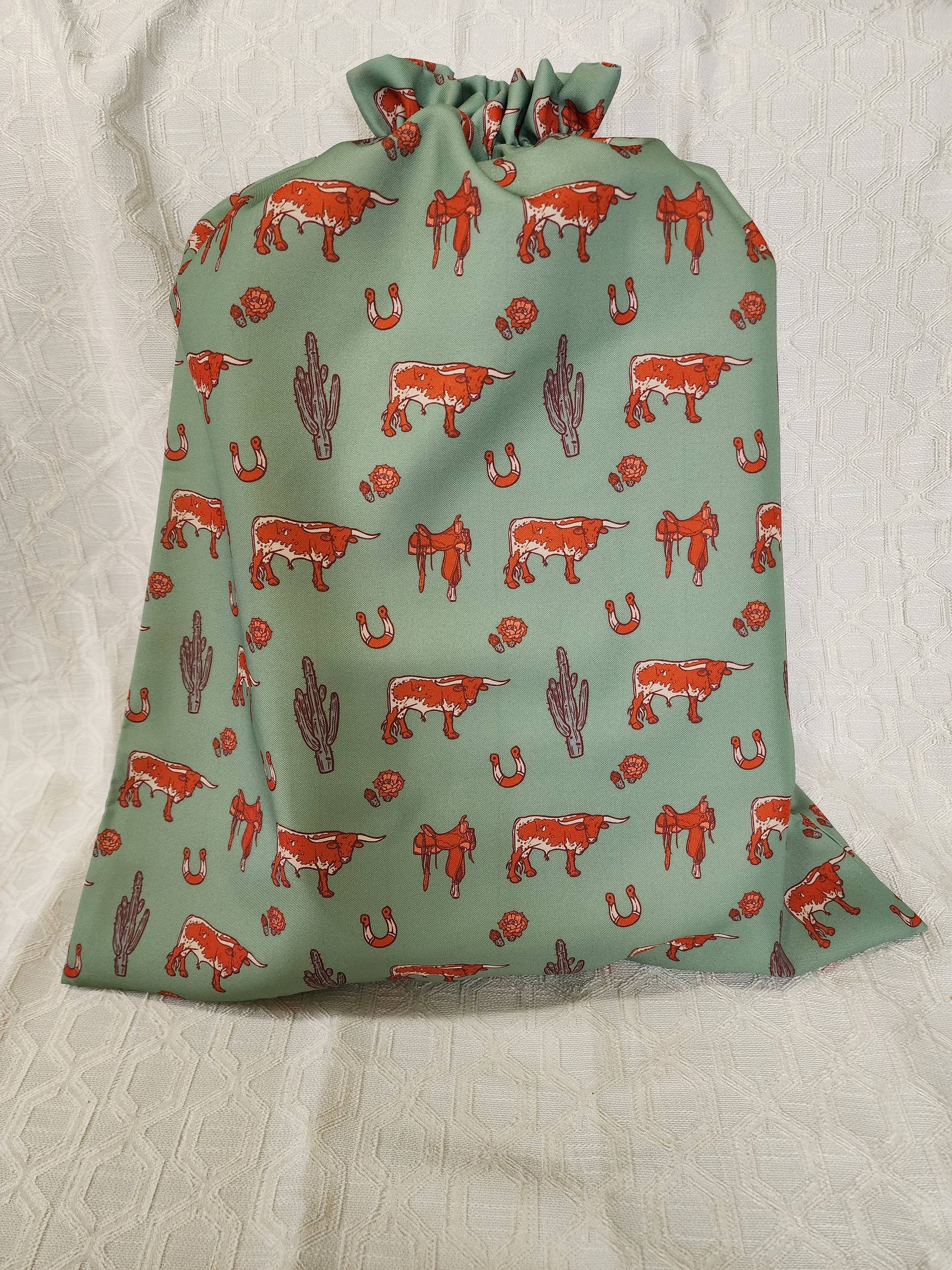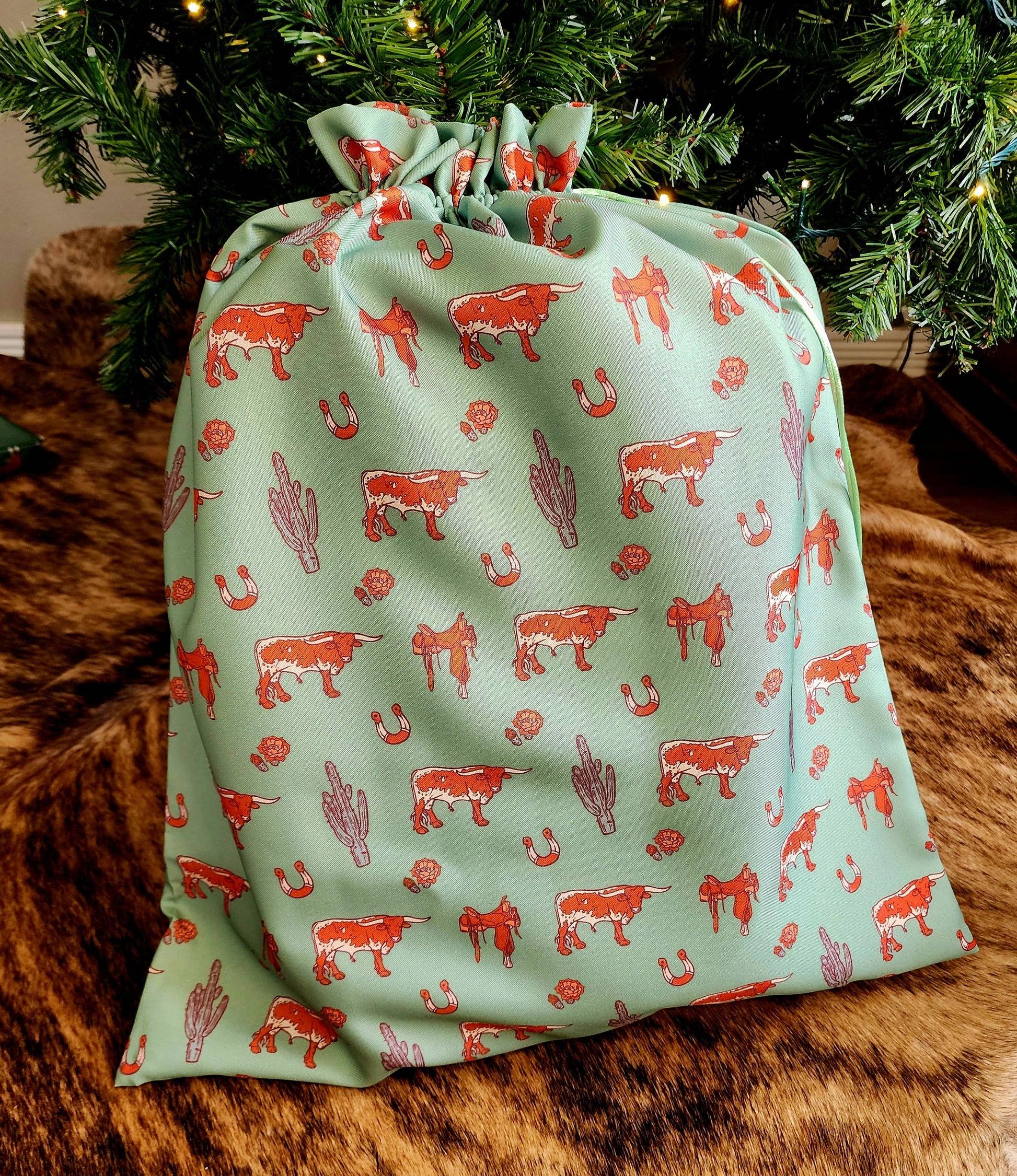 Each bag features our exclusive western-inspired prints — think bucking broncos, lassos, and desert stars — designed to bring the spirit of the West to every tree, stocking, or gift exchange. Made from durable, reusable fabric with a sturdy drawstring closure, these bags can be used year after year.